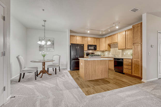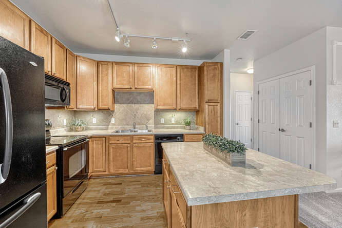 Natural light bathes this corner unit’s spacious floor plan in warmth, making it ideal for both relaxing and entertaining, while at the same time saving on energy costs. Let’s get cooking! The large kitchen boasts a center island perfect for meal prep, party spreads, or just a space for casual roundtable conversations with family and friends. There’s ample cabinet space for storage, a stylish modern backsplash, and real hardwood floors that add an elegant touch.