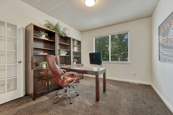 Also on the main level is a dedicated office with French doors, located next to a fully renovated half bathroom—offering flexibility for guests or remote work.