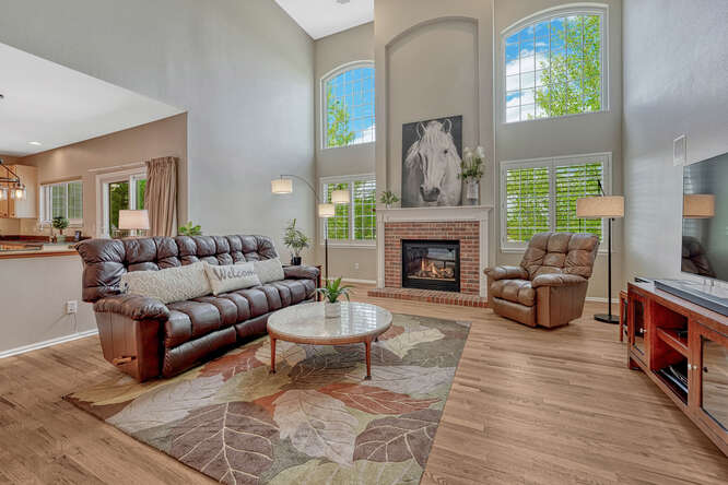 Welcome to your impressive GRAND LIVING ROOM, where soaring ceilings, dramatic floor-to-ceiling gas fireplace surround, and expansive windows fill the space with natural light. Real hardwood floors grace the entire main floor.